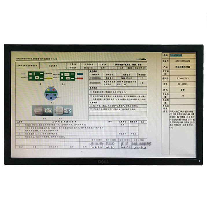 液晶電子看板,采用高分辨率,顯示內(nèi)容豐富,色彩和布局可根據(jù)客戶喜好進(jìn)行設(shè)計(jì),同時(shí)可通過以太網(wǎng)/無線網(wǎng)絡(luò)將工廠內(nèi)的所有電子看板進(jìn)行集中管理,并且將實(shí)時(shí)的生產(chǎn)數(shù)據(jù)上傳到服務(wù)器,管理人員在辦公室就可以實(shí)時(shí)查看生產(chǎn)進(jìn)度,返修率等數(shù)據(jù)。